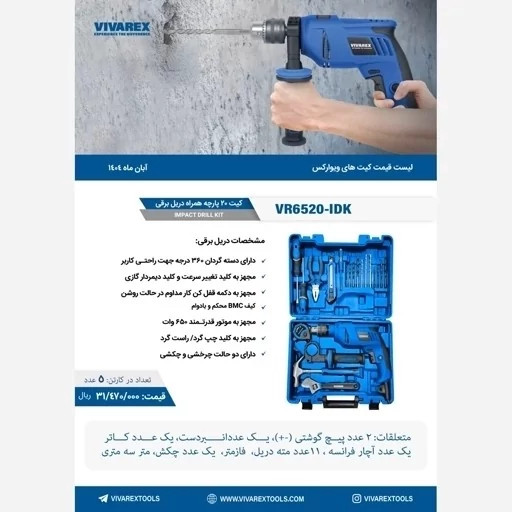 کیت دریل برقی ویوارکس (Vivarex) مدل VR6520 (که با کد فنی VR6520-IDK نیز شناخته میشود) یک مجموعه کامل برای کارهای خانگی و نیمهصنعتی است. ویژگی اصلی این محصول، قرارگیری یک دریل قدرتمند در کنار مجموعهای از ابزارهای دستی پرکاربرد در یک کیف حمل است